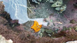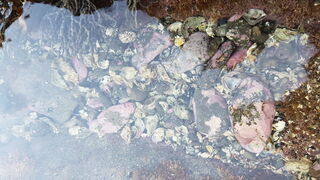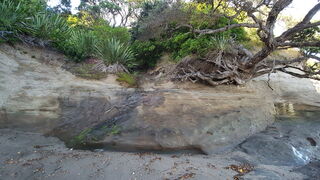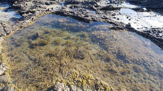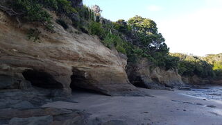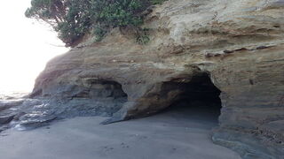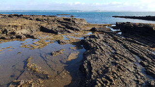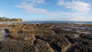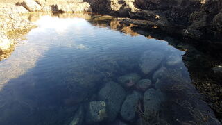Low-tide rock formations stretch in two directions; one mostly flat with 5 small caves, the other a short walk away but rich with rockpools and marine life to the observant eye. Bring suitable shoes for the barnacles & oyster shells.